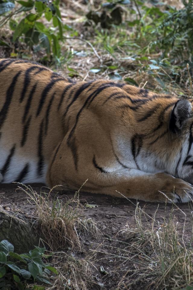 Обои Большой полосатый красивый тигр сидит в засаде