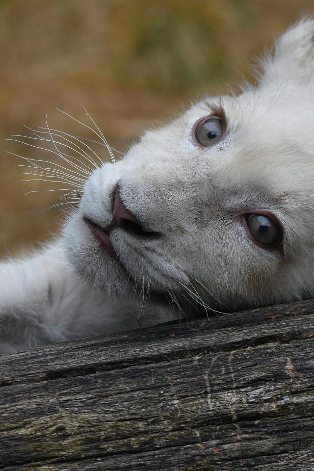 Обои Маленький белый львенок лежит на дереве