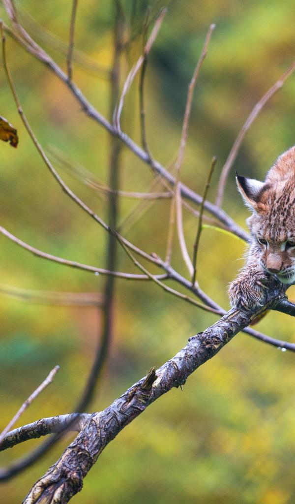 Обои Дикая рысь в лесу у сухого дерева