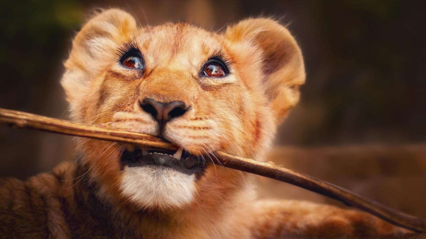 Обои Маленький забавный львенок грызет ветку