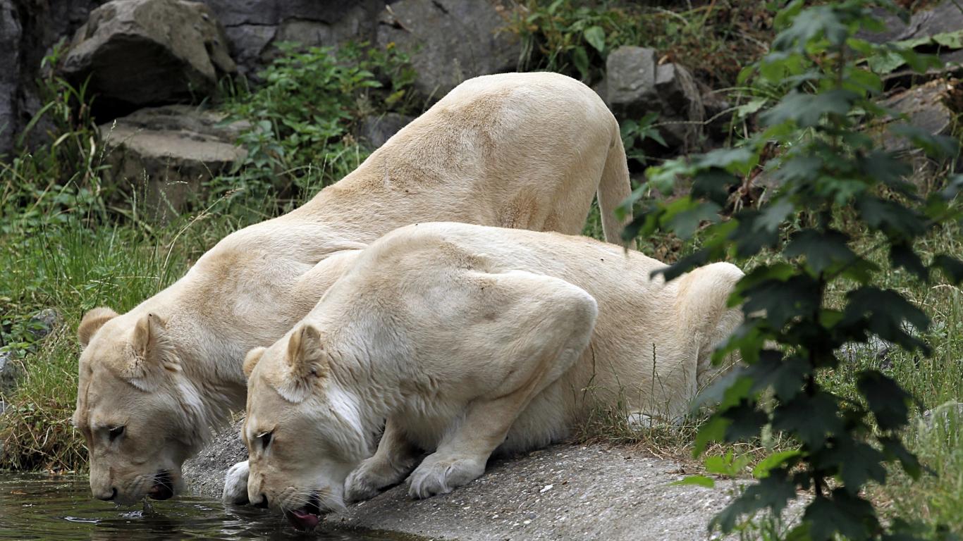 Обои Две белые львицы у водопоя