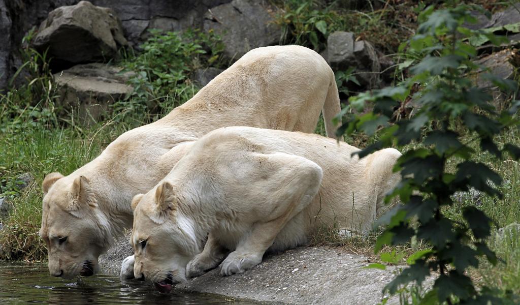 Обои Две белые львицы у водопоя