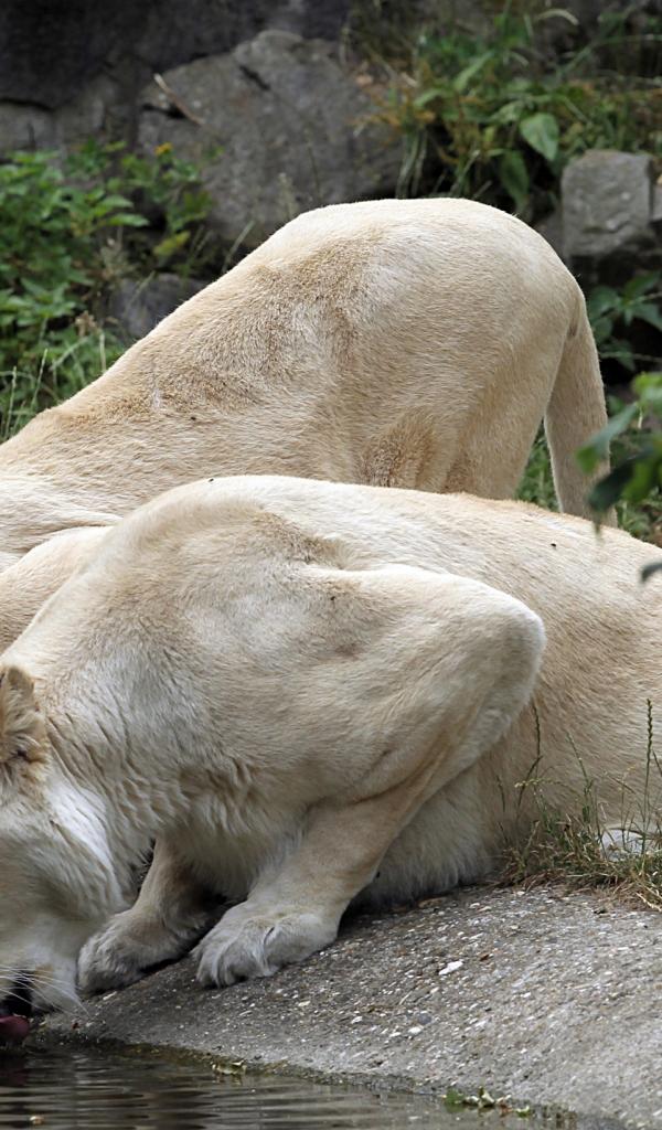 Обои Две белые львицы у водопоя