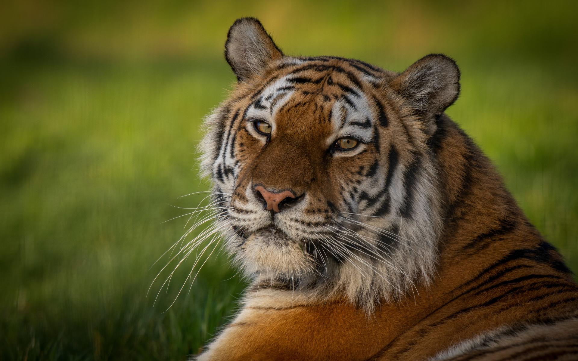 Обои Полосатый тигр с большой мордой лежит на зеленой траве