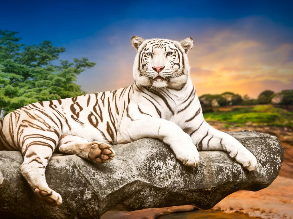 Обои Красивый белый тигр лежит на камне