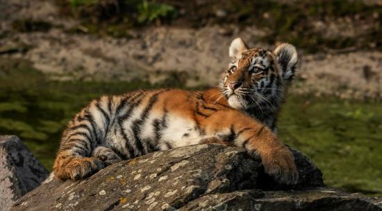 Обои Маленький полосатый тигренок лежит на камне