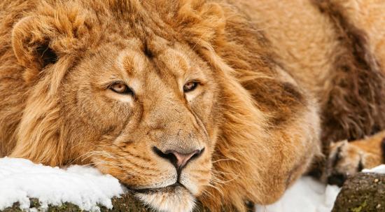 Обои Большой лев лежит на снегу зимой