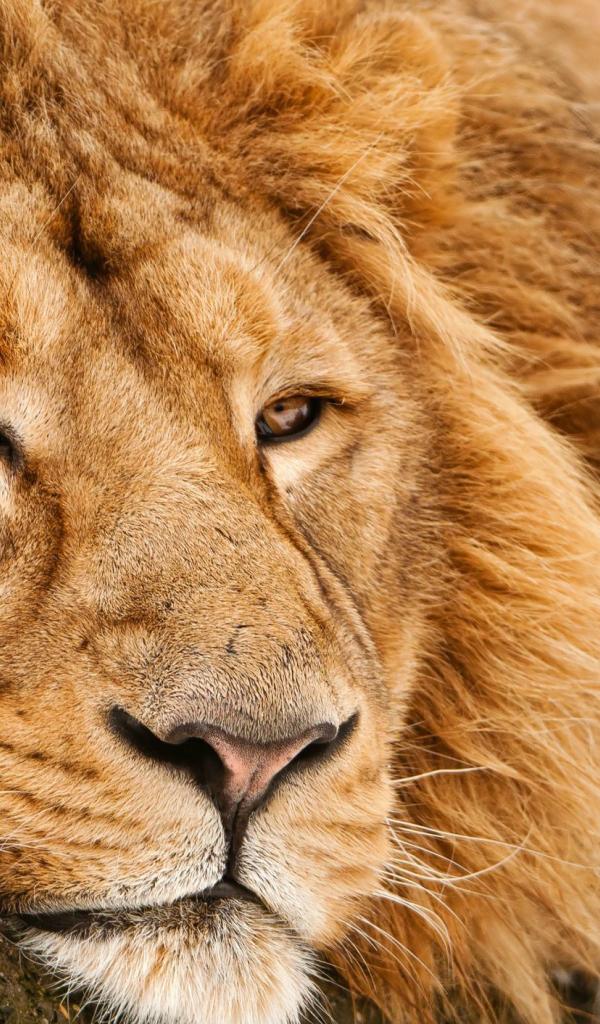 Обои Большой лев лежит на снегу зимой