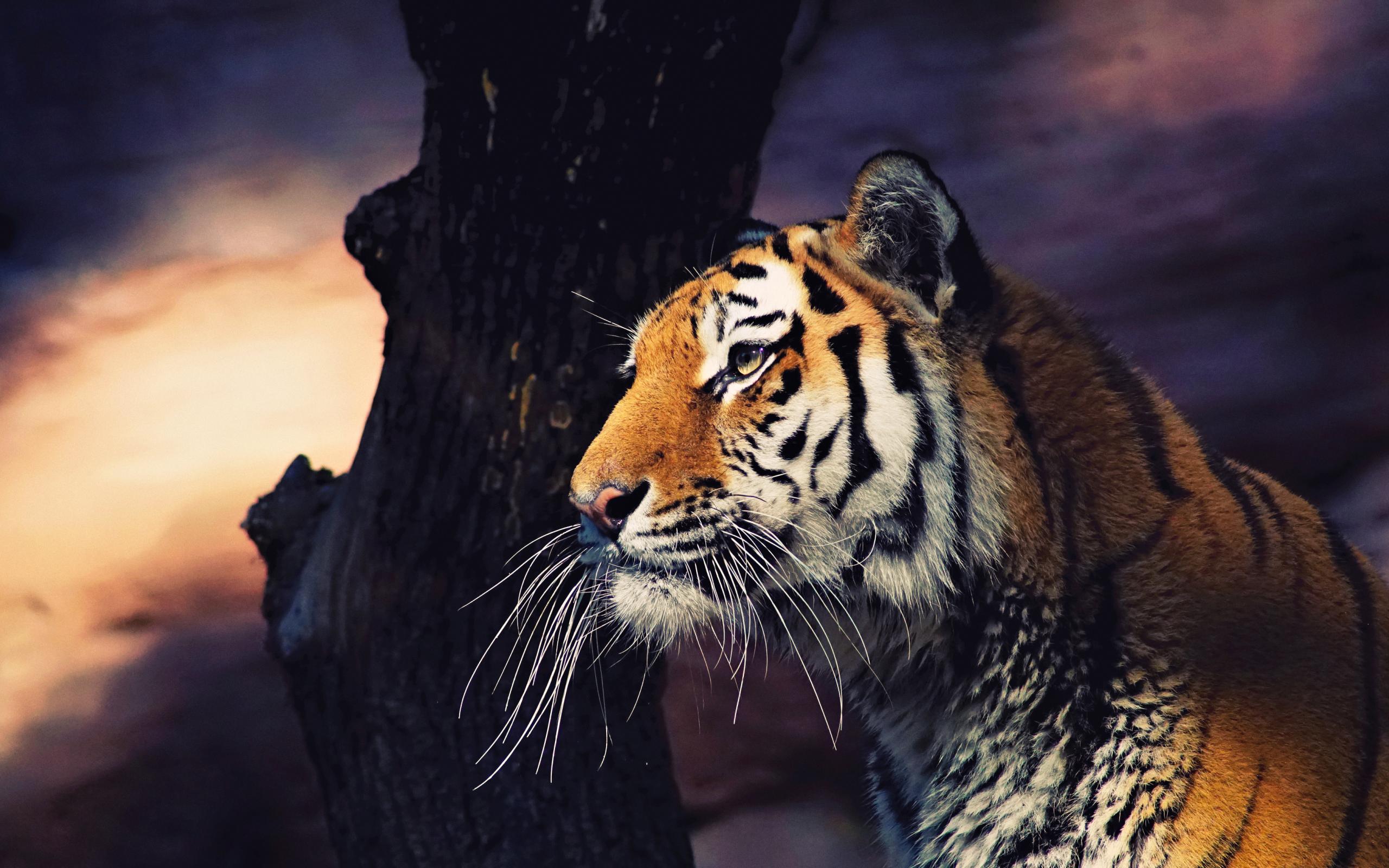 Обои Большой полосатый тигр у дерева