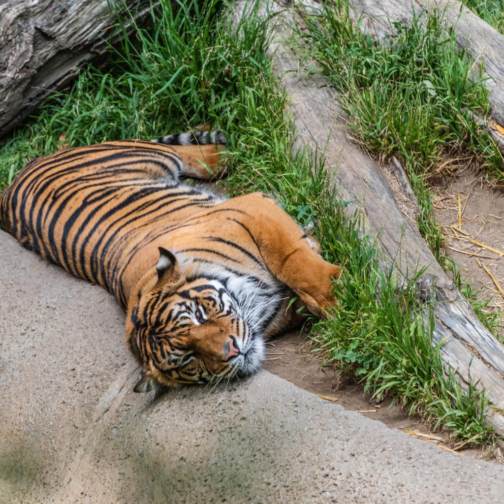 Обои Большой полосатый тигр лежит на зеленой траве в зоопарке