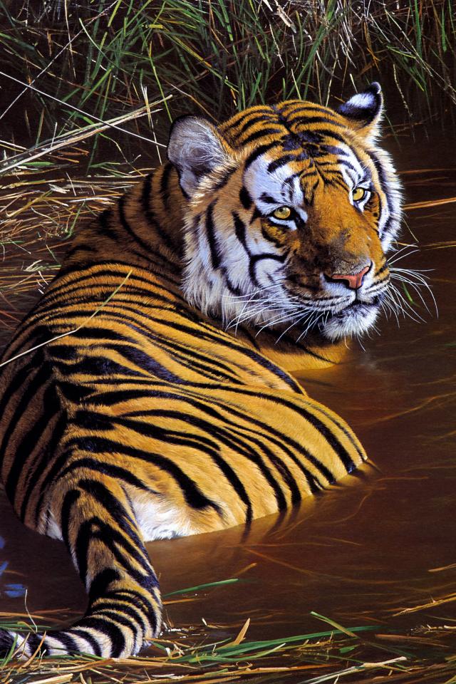 Обои Большой полосатый тигр лежит в зеленой траве