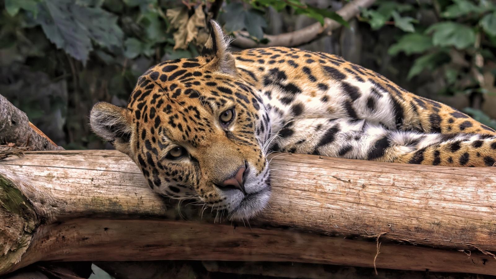 Обои Большой пятнистый ягуар лежит на сухом дереве