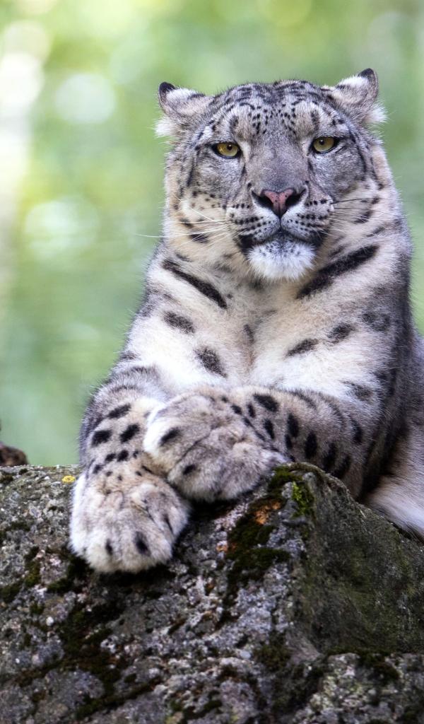 Обои Большой снежный барс лежит на камне