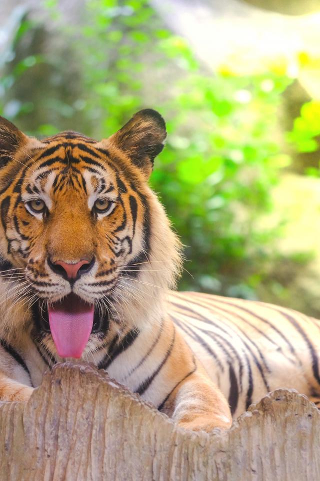 Обои Полосатый тигр с высунутым языком лежит в зоопарке
