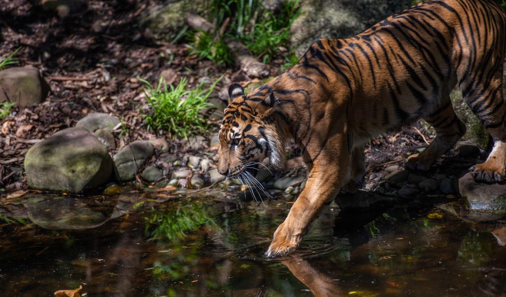 Обои Большой полосатый тигр идет к водопою