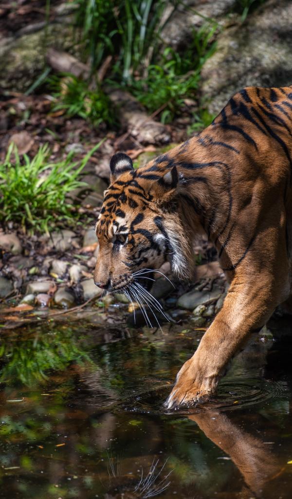 Обои Большой полосатый тигр идет к водопою