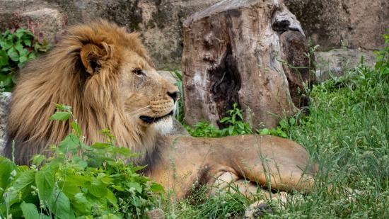 Обои Большой лев лежит на зеленой траве у дерева