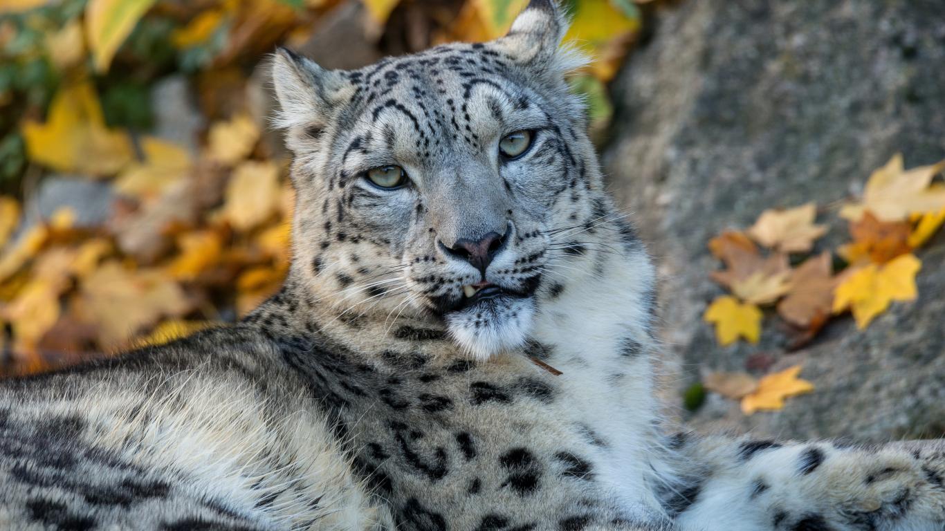 Обои Большой пятнистый снежный барс лежит на земле осенью
