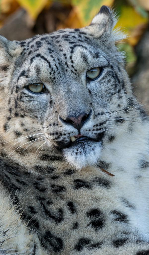 Обои Большой пятнистый снежный барс лежит на земле осенью