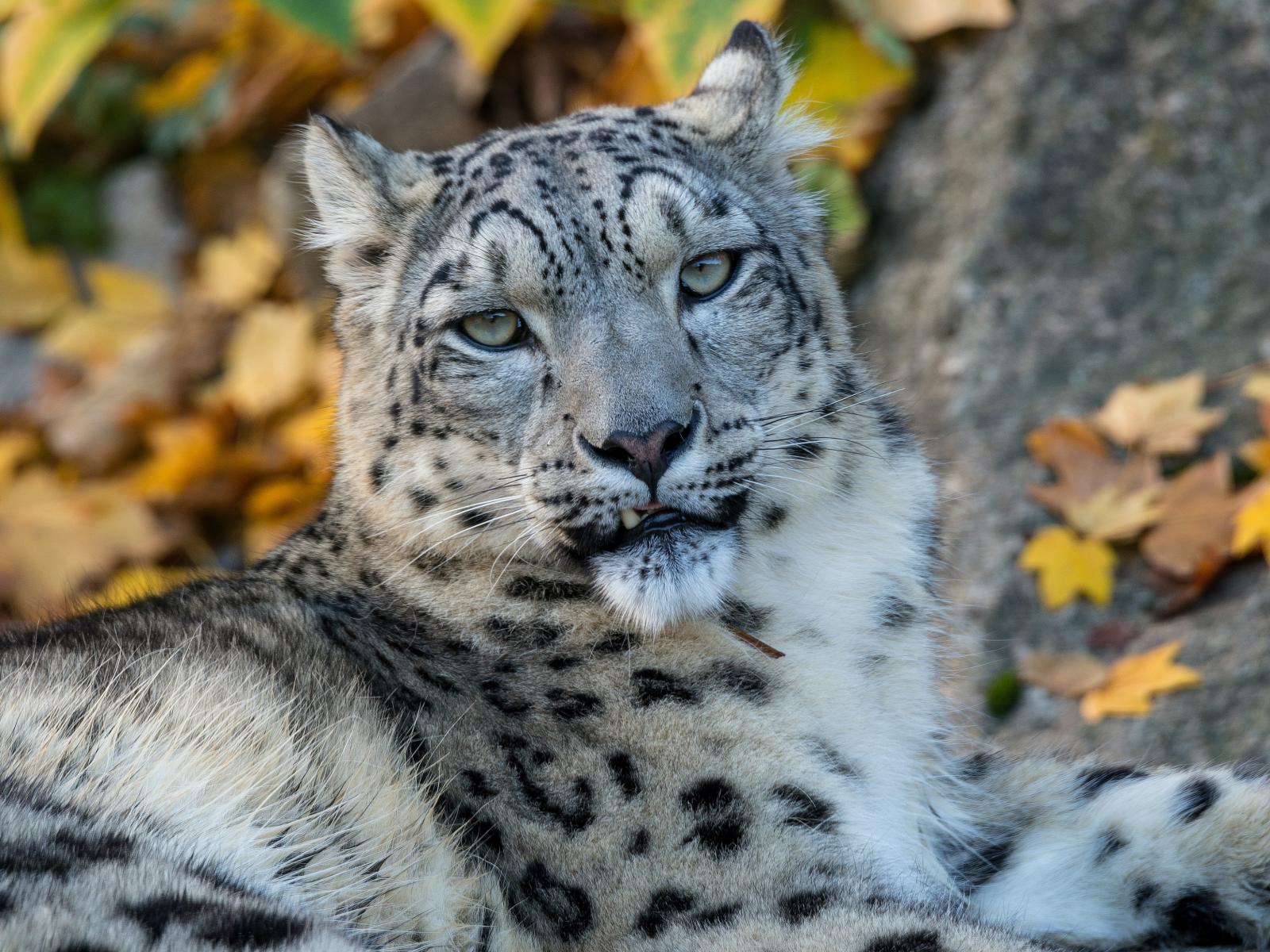 Обои Большой пятнистый снежный барс лежит на земле осенью