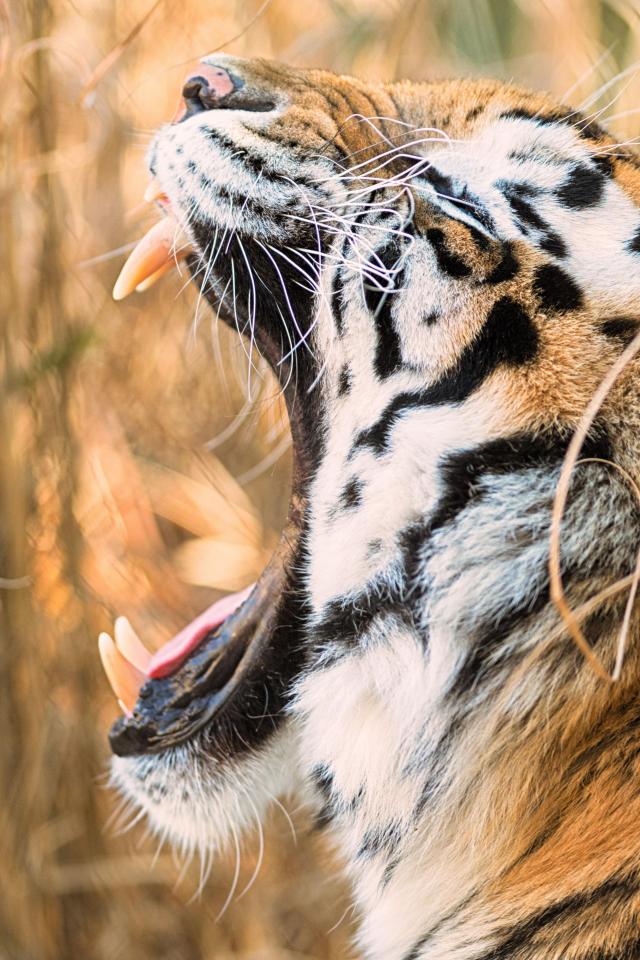 Обои Большой полосатый тигр зевает в зарослях травы