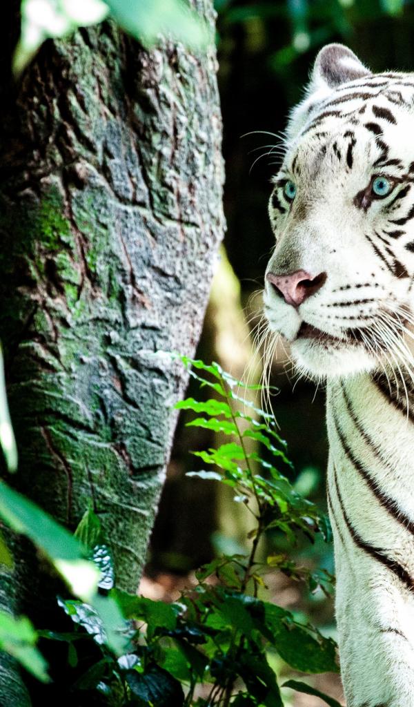 Обои Большой белый тигр с голубыми глазами идет по лесу