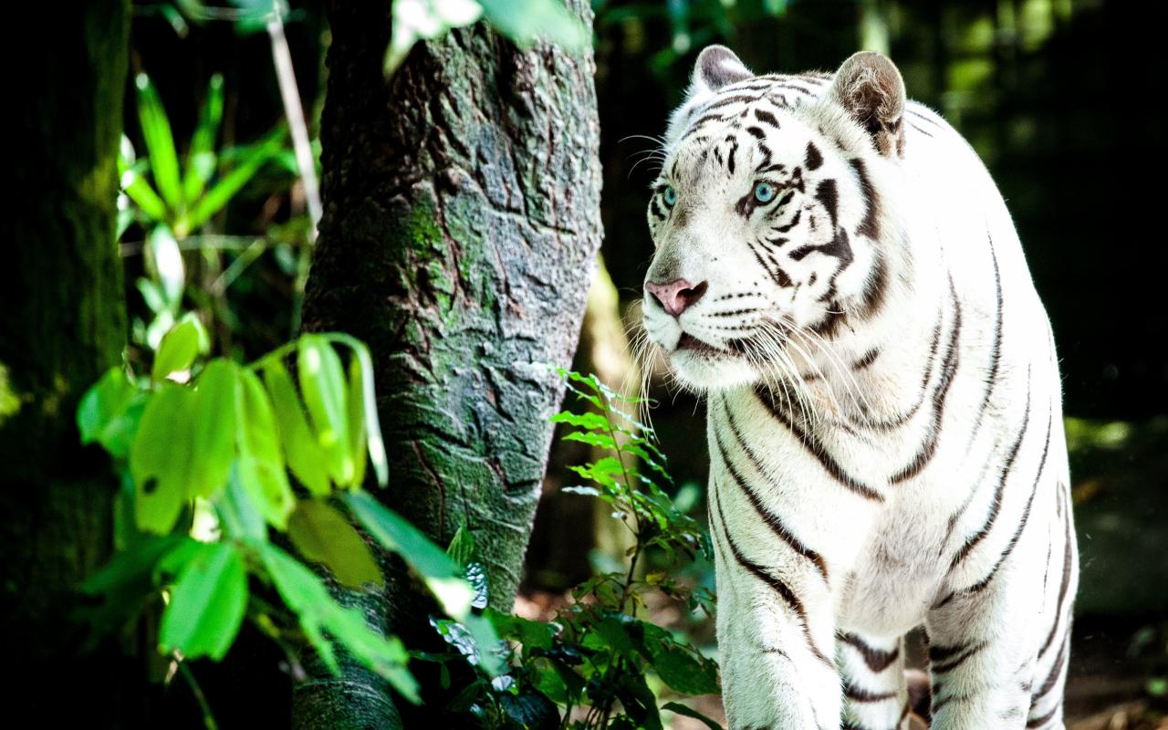 Обои Большой белый тигр с голубыми глазами идет по лесу