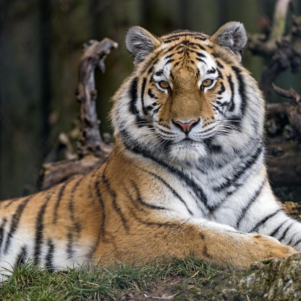 Обои Большой бенгальский тигр лежит на траве в зоопарке