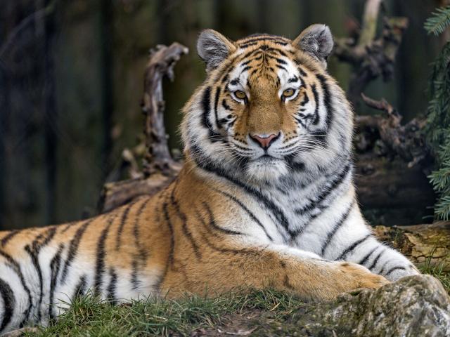 Обои Большой бенгальский тигр лежит на траве в зоопарке