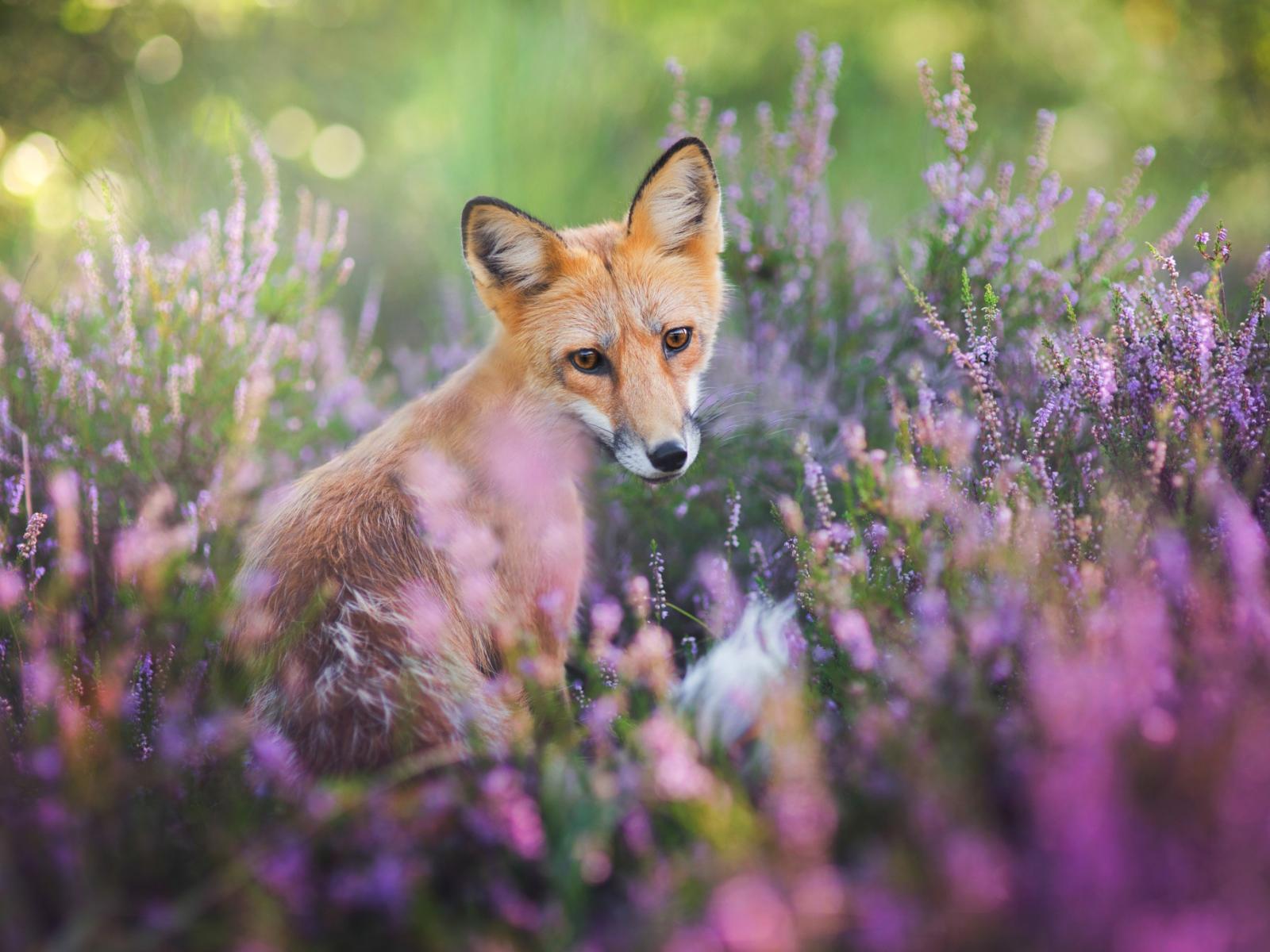 Обои Рыжая лиса в сиреневых цветах