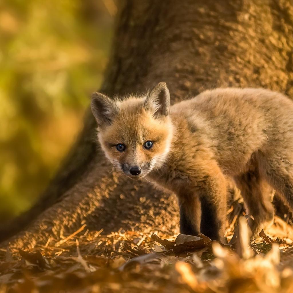 Обои Маленький лисенок на желтой листве