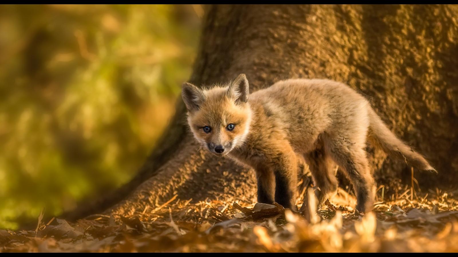 Обои Маленький лисенок на желтой листве