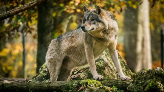 Обои Большой волк в лесу стоит у камня