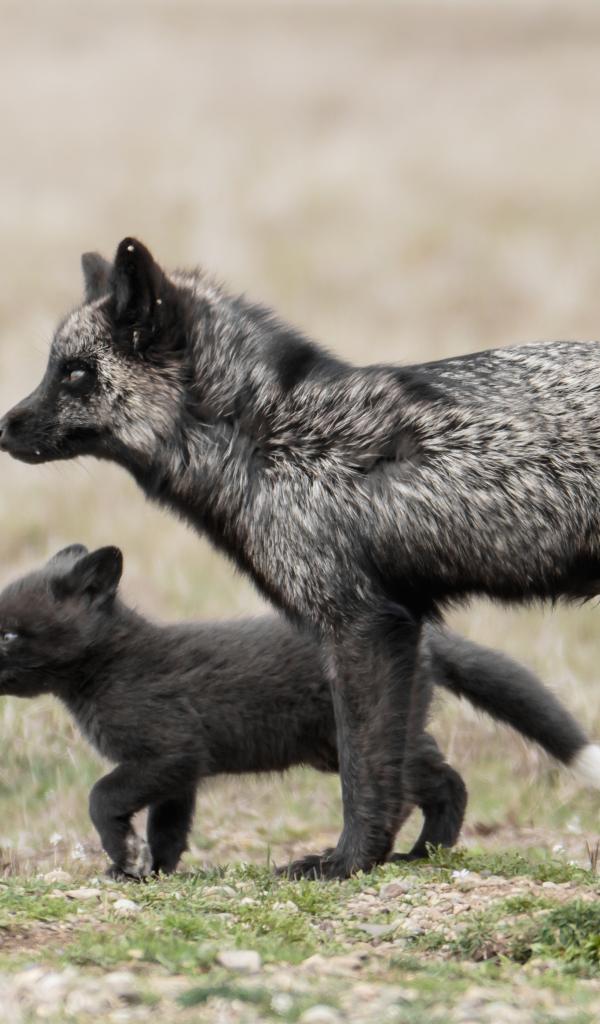 Обои Черная лисица с маленьким детенышем