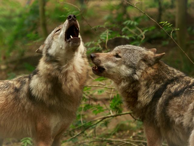 Обои Два серых волка воют в лесу