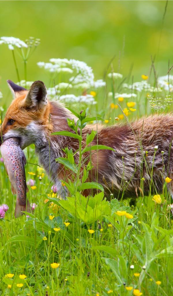 Обои Рыжая лиса с рыбой в зубах в траве