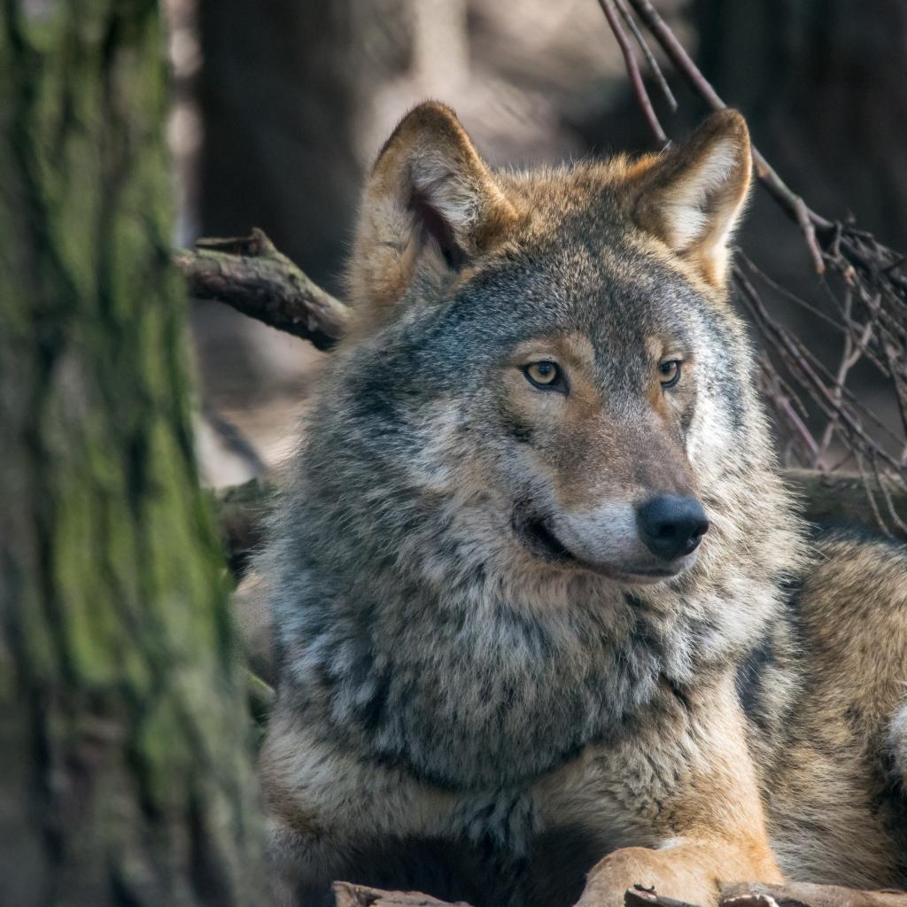 Обои Большой серый волк лежит у дерева