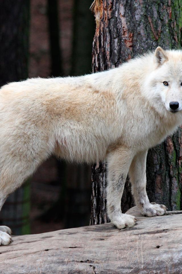 Обои Белый большой волк стоит на сухом дереве