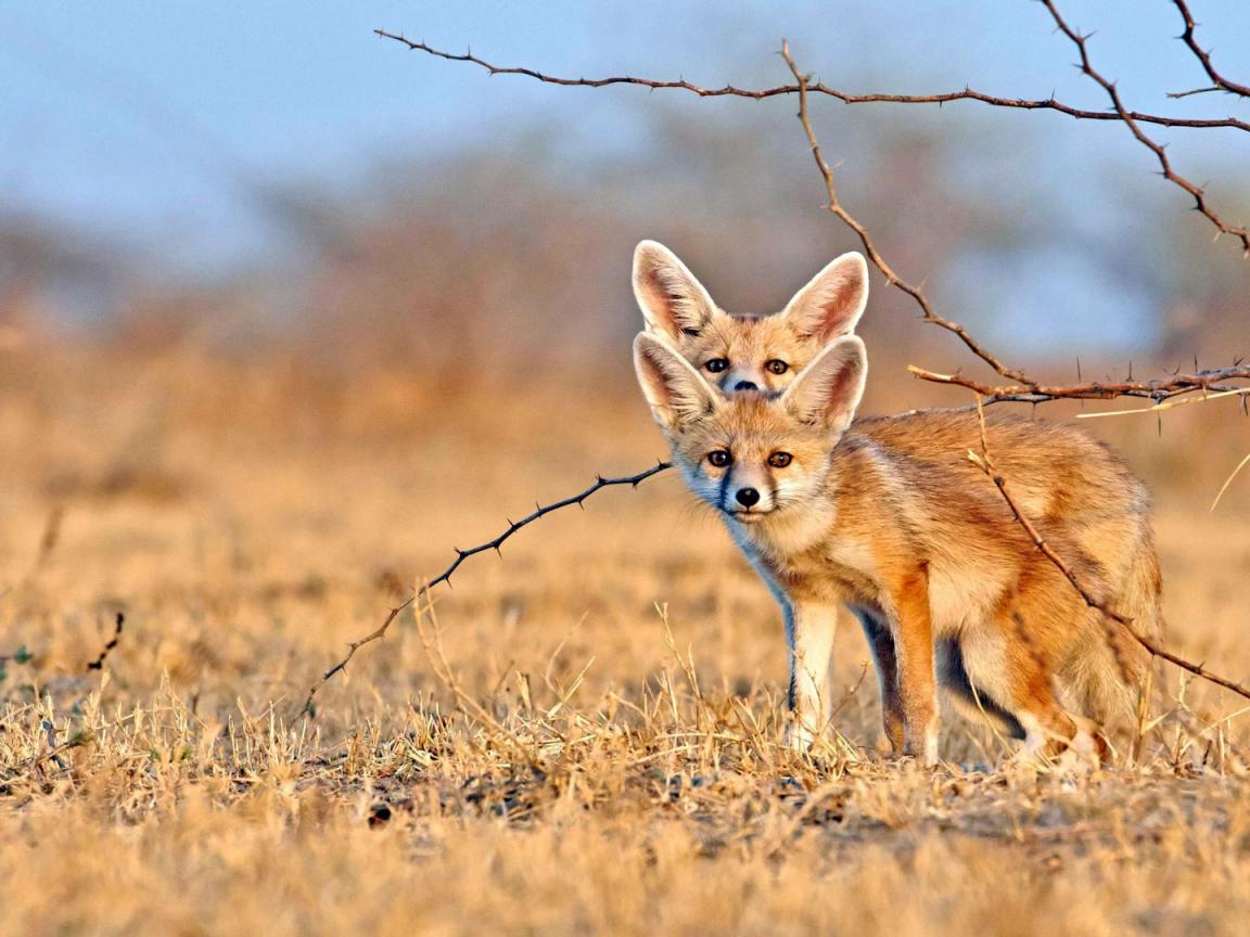 Обои Две лисы фенек на сухой траве