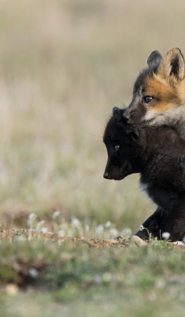 Обои Два маленьких лисенка на траве