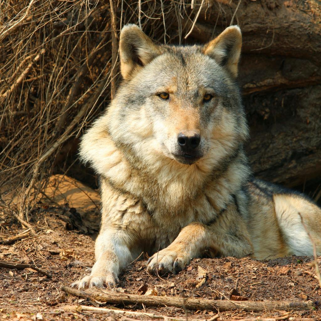 Обои Серьезный серый волк лежит под сухим деревом