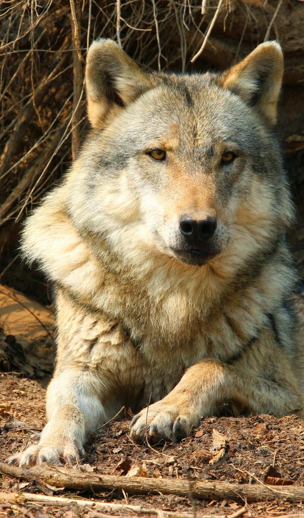 Обои Серьезный серый волк лежит под сухим деревом