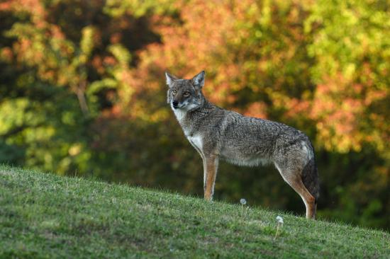 Обои Серый волк стоит на зеленой траве