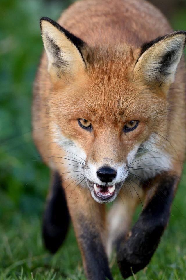 Обои Хитрая грозная хищная лиса идет по зеленой траве
