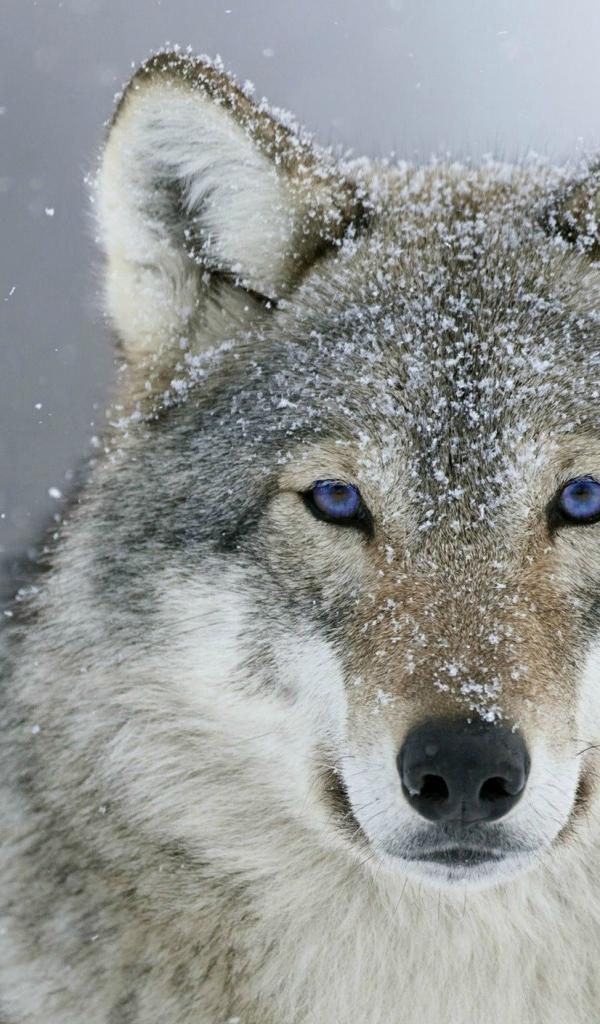 Обои Серый голубоглазый волк с мордой в снегу