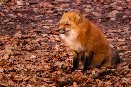 Обои Довольная лиса сидит на сухой опавшей листве