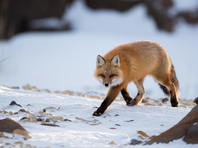 Обои Большая рыжая лиса идет по снегу зимой