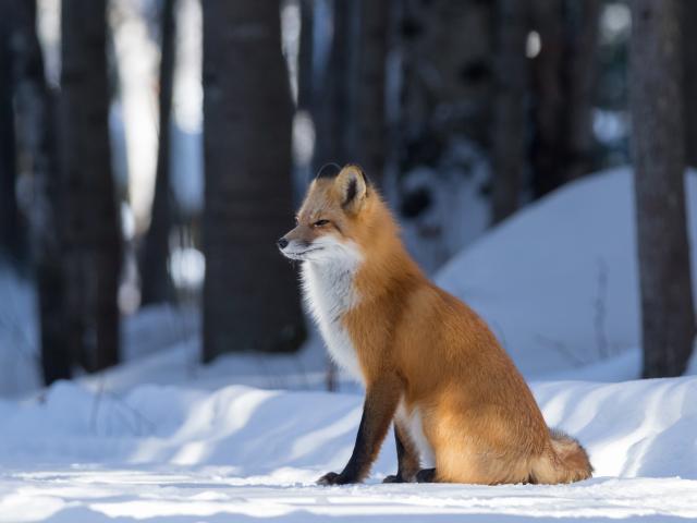 Обои Хитрая рыжая лиса сидит на снегу в лесу