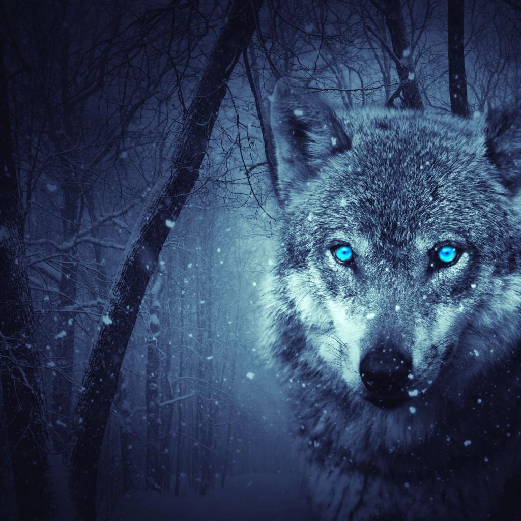 Обои Серый волк с голубыми глазами в холодном зимнем лесу