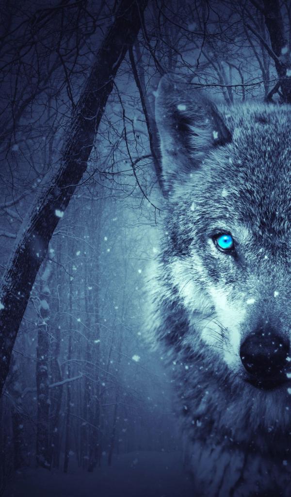 Обои Серый волк с голубыми глазами в холодном зимнем лесу